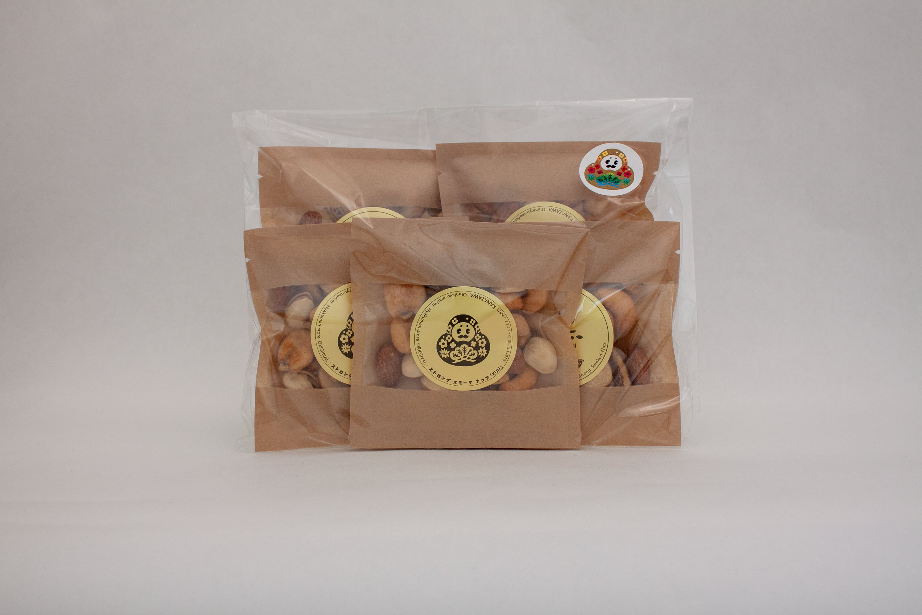 【原材料】カシューナッツ・アーモンド・マカダミアナッツ・ブラジルナッツ(ベトナム)、ピスタチオ(アメリカ)、ジャイアントコーン(ペルー)、植物油脂、食塩、調味料(アミノ酸等)